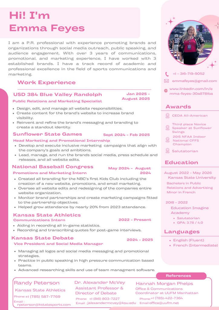 “Emma is a dedicated, hardworking individual who exemplifies the qualities of a well-rounded, motivated leader. Her outstanding communication skills, ability to work collaboratively, and enthusiasm for learning make her a strong candidate for your team. I have no doubt that she will bring the same level of excellence and drive to this position that she has demonstrated in her time at Kansas State University.”